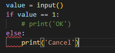 이 코드의 경우 value 값이 1일 때 실행할 조건문의 바디 부분에 있던 print() 함수를 주석처리해서 바디가 비어있는 상황이다. 이 경우 바디가 비어있기 때문에 문법에러가 발생한다.