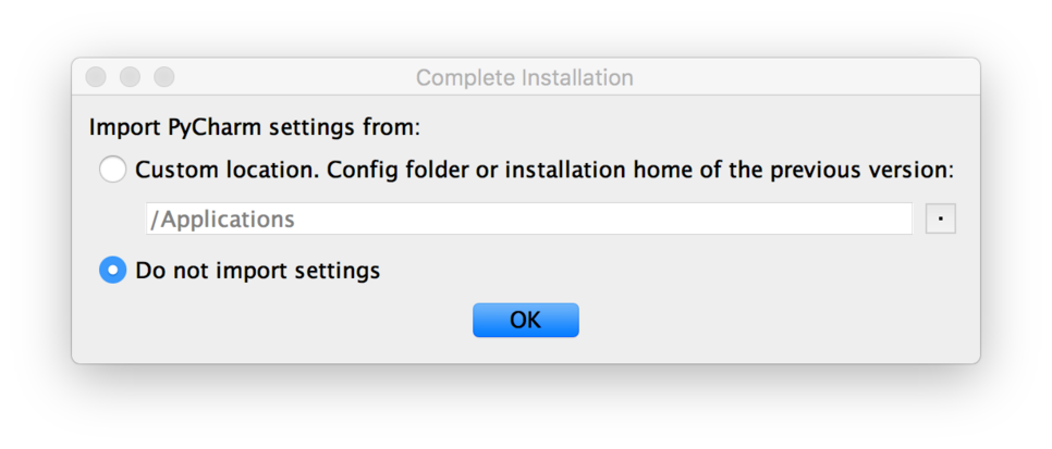 기존에 사용중이던 파이참 프로젝트가 있다면 불러와서 사용할 수 있다. 파이참을 처음 설치하는 경우에는 'Do not import settings'를 선택해서 초기화하고 진행하면된다.