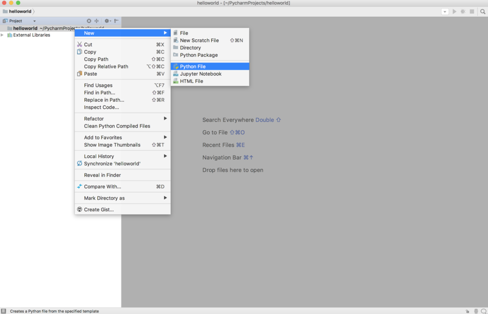 새로운 파일을 만들어보자. 왼쪽 프로젝트 창에서 프로젝트에 우클릭을 하고, [New] - [Python File]을 클릭해서 새로운 파이썬 스크립트 파일을 생성해준다.