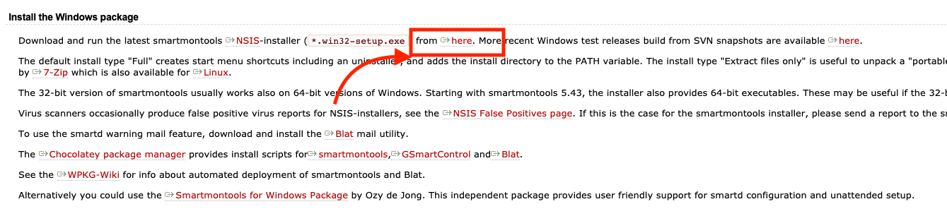 윈도우용 smartctl 설치파일은 smartmontools.org/wiki/Download 페이지에서 다운로드할 수 있다. 페이지에 들어가서 Install the Windows package 섹션을 보면 NSIS-installer 링크를 확인할 수 있다.