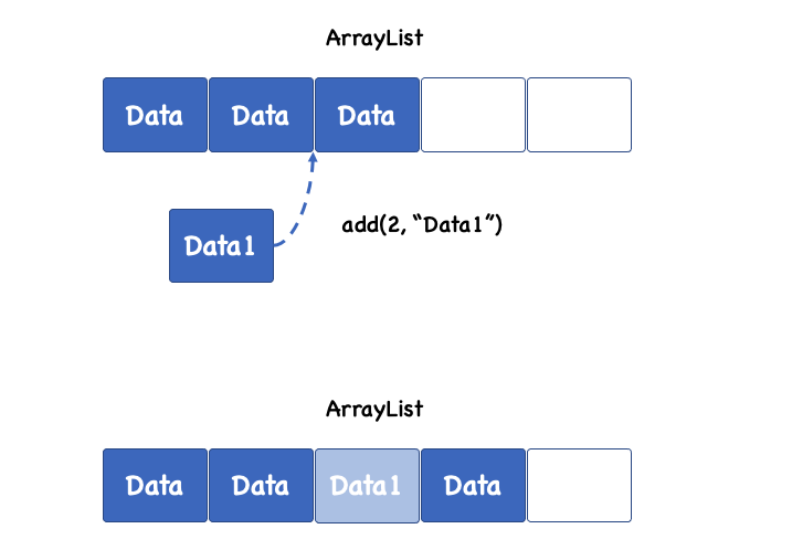 배열의 중간부분에 새로운 데이터를 끼워넣는 동작이다. 이 경우 입력한 위치에 새로운 데이터를 끼워넣고, 그 뒤에 있는 데이터는 모두 한칸씩 뒤로 밀려나게 된다. 한칸씩 데이터들을 뒤로 밀어내는 동작은 ArrayList의 사이즈가 커질 수록 비효율적이 된다. (O(n) 시간을 소모하게 된다.)