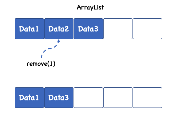 remove(1)을 호출하면 1번 인덱스에 해당하는 데이터를 삭제한다. 이 때, 제거된 데이터 뒤쪽에 있는 항목들은 한칸씩 앞으로 땡겨지게 된다. add() 때와 마찬가지로 한칸씩 땡기는 동작이 오버헤드로 작용할 수 있다.