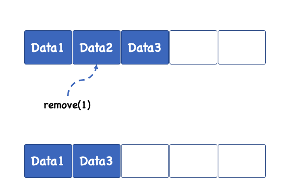 remove(1) 메소드를 호출하면 1번 인덱스에 해당하는 데이터를 삭제한다. 데이터를 삭제하고 그 뒤에 있는 데이터들을 한칸씩 앞으로 땡겨주게 된다. add() 메소드와 마찬가지로 Vector 크기가 커질 수록 이 동작이 오래 걸린다.