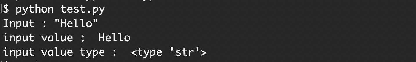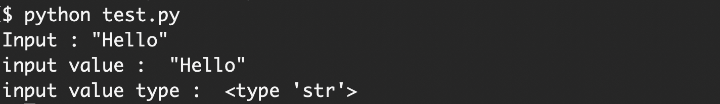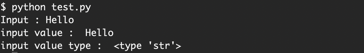 정수 타입의 숫자를 입력했지만 반환되는 타입은 문자열 'str'이다. 정수말고 실수, 문자열 값 등을 입력해도 모두 'str' 타입으로 처리가 된다.