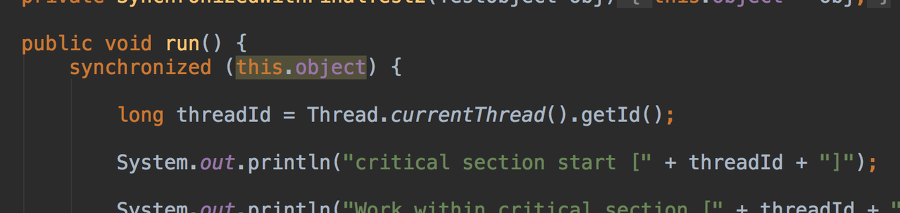 일단은 13번 스레드와 14번 스레드가 동시에 수행된다. 그러다가 synchronized 키워드에 줄을 서게되고 13번 스레드가 먼저 critical section으로 들어가서 실행된다. 이후 10초간 Sleep 한 다음 13번 스레드가 synchronized 블럭을 빠져나간 다음 기다리던 14번 스레드가 critical section으로 들어간다. 의도했던대로 잘 수행된다.