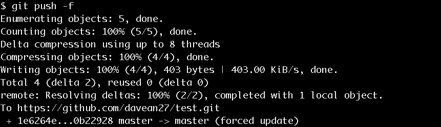 edit으로 선택한 모든 항목에 대해서 수정이 끝나면 "Successfully rebased and updated refs/heads/master"라는 메시지가 뜬다. 이제 리모트에 강제로 푸쉬해주자.
