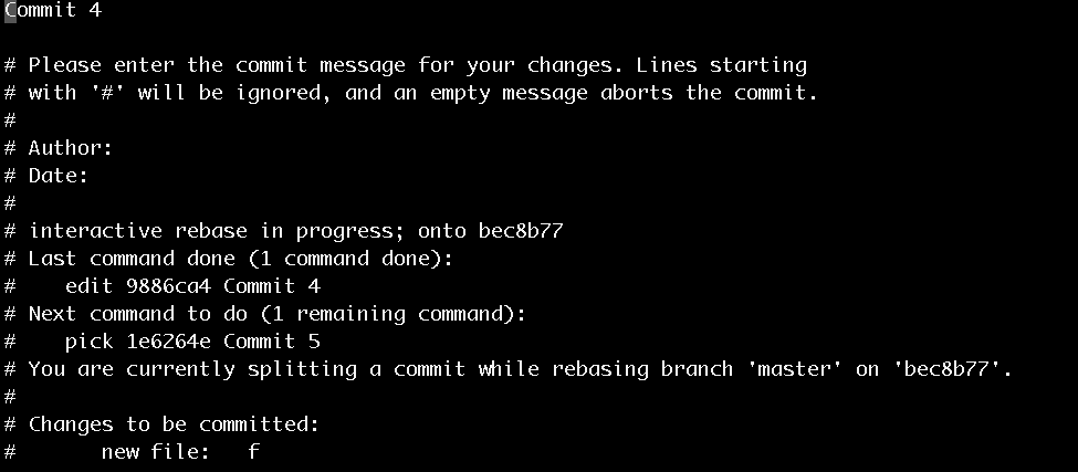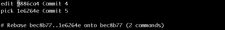 Commit 4에 해당하는 커밋의 작성자를 고칠 예정이므로 9886ca4에 해당하는 커밋의 pick을 edit으로 고쳐준다. 에디터 창을 저장 및 종료 (:wq)하면 rebase가 시작된다.