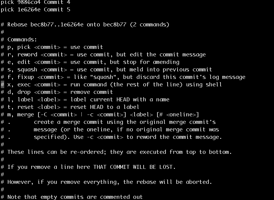 # 문자로 시작되는 라인은 전부 주석이고 중요한 라인은 pick으로 시작되는 라인이다. 정보를 수정하고 싶은 커밋 앞에 있는 pick을 edit이라는 글자로 바꿔준다.