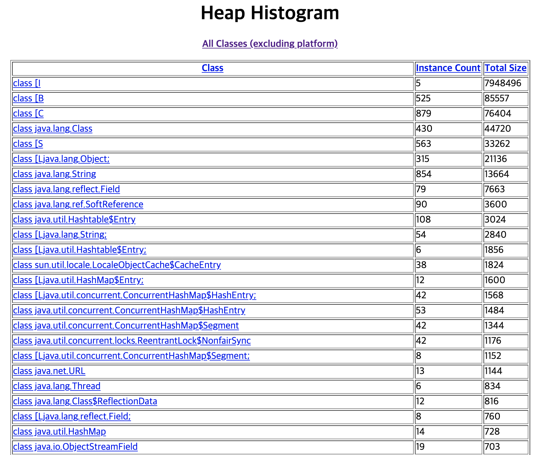JVM 위에서 어떤 클래스의 객체가 몇 개 만들어졌는지 확인할 수 있다. 만약 하나의 클래스가 압도적으로 많이 생성되어 있고 그 숫자가 지속적으로 늘어나고 있다면, 그 클래스를 사용하는 코드 부분을 확인해서 메모리 사용량 문제를 해결할 수 있다. 이 정보 역시 주기적으로 확인해서 메모리 릭을 유추해볼 수 있다.