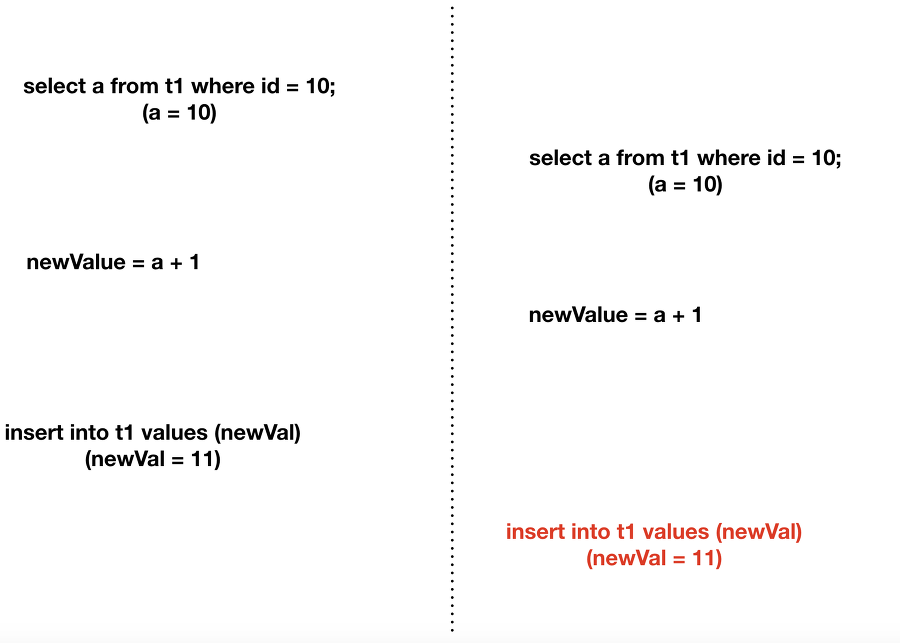 테이블 혹은 업데이트하려는 Row에 락을 잡아놓고 select와 insert 사이에 Critical Section을 잡아놓으면 Phantom Read 현상이 발생하지 않게 된다. 하지만 Lock을 잡는 행위는 성능저하나 데드락 등의 문제를 일으킬 가능성이 있다.