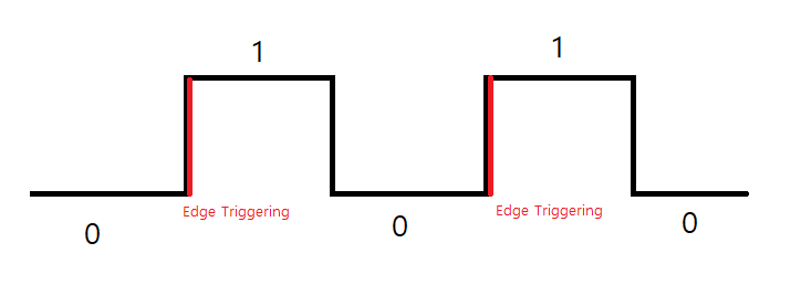 위 그림에서 보면 상태가 0에서 1로 전이되는 순간 에지 트리거가 이벤트를 발생시킨다. 상태가 1인 상황에서 에지 트리거를 실행시키면 다음 상승에지(0 -> 1)까지 기다리게 된다.