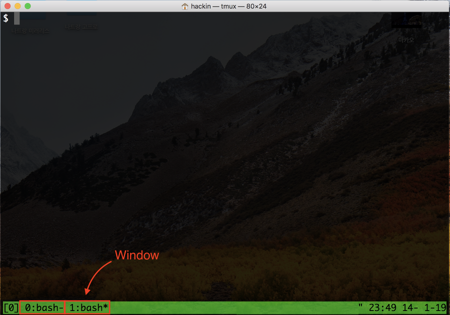 현재 실행 중인 세션의 하단을 보면 현재 생성되어 있는 윈도우들의 리스트가 탭처럼 나와있다. 현재 0번과 1번 윈도우가 생성되어 있고, * 표가되어있는 윈도우가 현재 화면에 뿌려지고 있는 윈도우다. 만약 윈도우를 0번으로 전환하면 1번 윈도우는 백그라운드로 전환된다.
