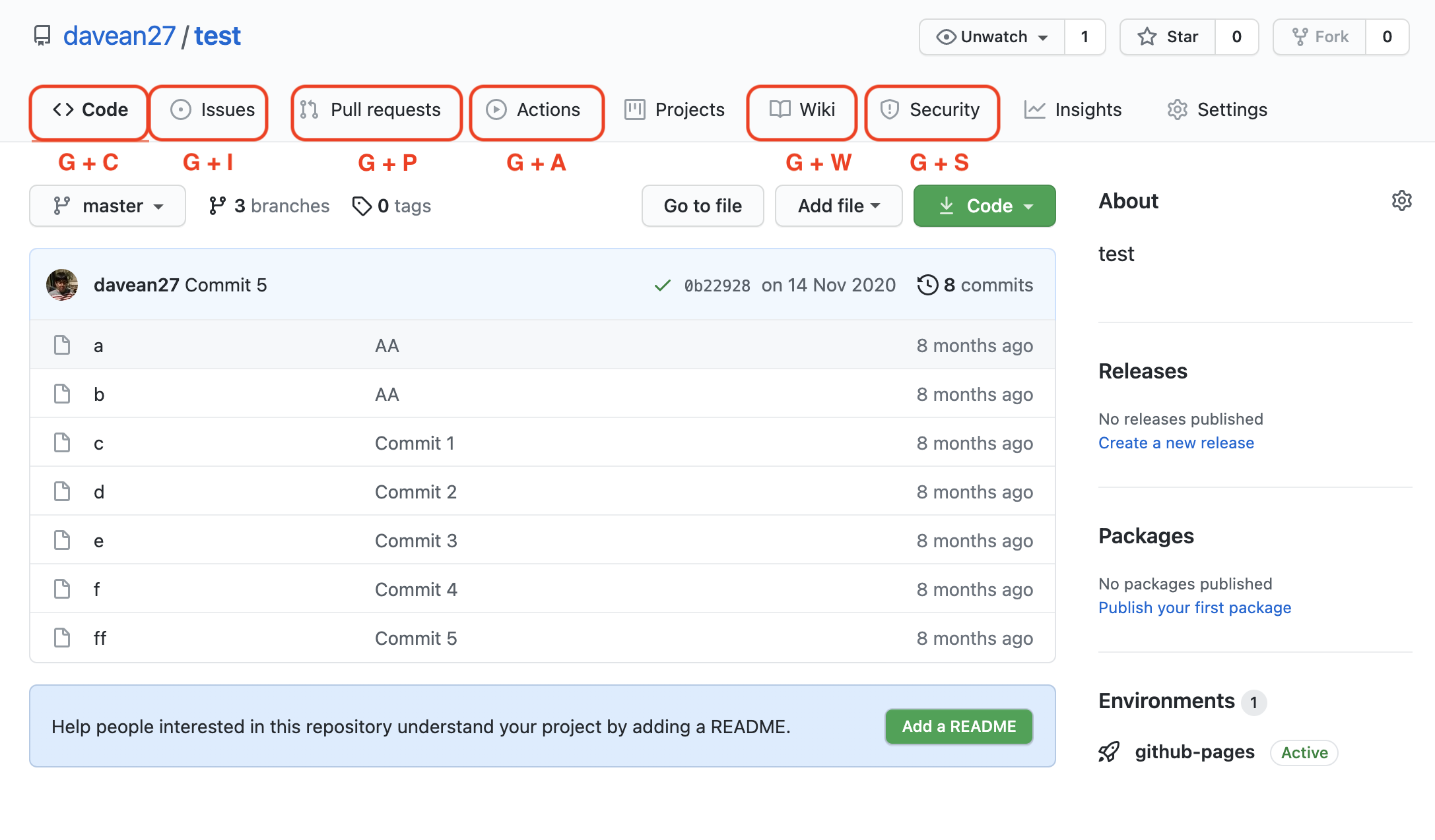 우선 레파지토리의 탭을 이동하는 단축키는 [G] 키와 각 탭의 첫 글자를 조합하면 된다. 예를 들어 'Code' 탭은 [G] + [C]로 이동할 수 있고, 'Issues' 탭은 [G] + [I] 로 이동할 수 있다. 'Go to {XXX 탭}'에서 G와 탭 이름의 첫 글자를 따왔다고 생각하면 된다. (그 밖에 [G] + [B]를 누르면 Projects, [G] + [G]를 누르면 Discussions로 넘어간다)