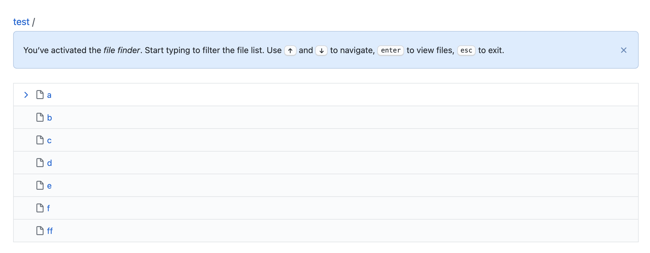 그러면 찾고자하는 파일 이름을 입력할 수 있고, 하단에는 이름에 해당하는 검색 결과가 표시된다. 검색 결과 옆에는 '>' 모양의 커서가 있고, 위아래 화살표를 이용해서 네비게이트 할 수 있다. 엔터를 누르면 '>' 커서가 위치한 파일이 열리게 된다. [ESC] 키를 누르면 파일 검색 페이지를 나가게 된다.