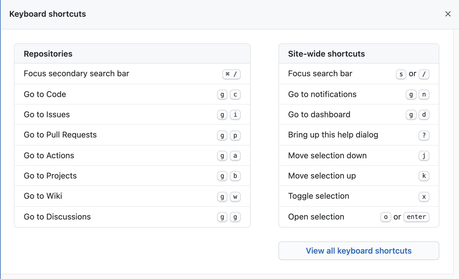 이 밖에도 깃허브에서는 다양한 단축키를 지원한다. [?] 버튼을 누르면 자주 사용하는 단축키 목록을 볼 수 있다.