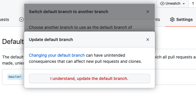 기본 브랜치를 변경하는 것은 저장소에 생각보다 큰 영향을 줄 수 있다. I understand, update the default branch를 눌러 진행한다.