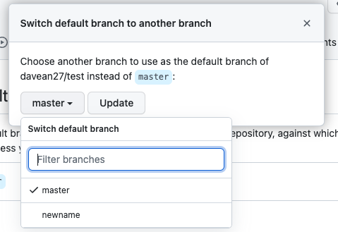 기본 브랜치를 변경할 수 있는 메뉴가 나온다. 드랍 다운을 눌러서 기본 브랜치로 변경하고 싶은 브랜치를 선택한 다음 Update 버튼을 눌러 진행하면된다.
