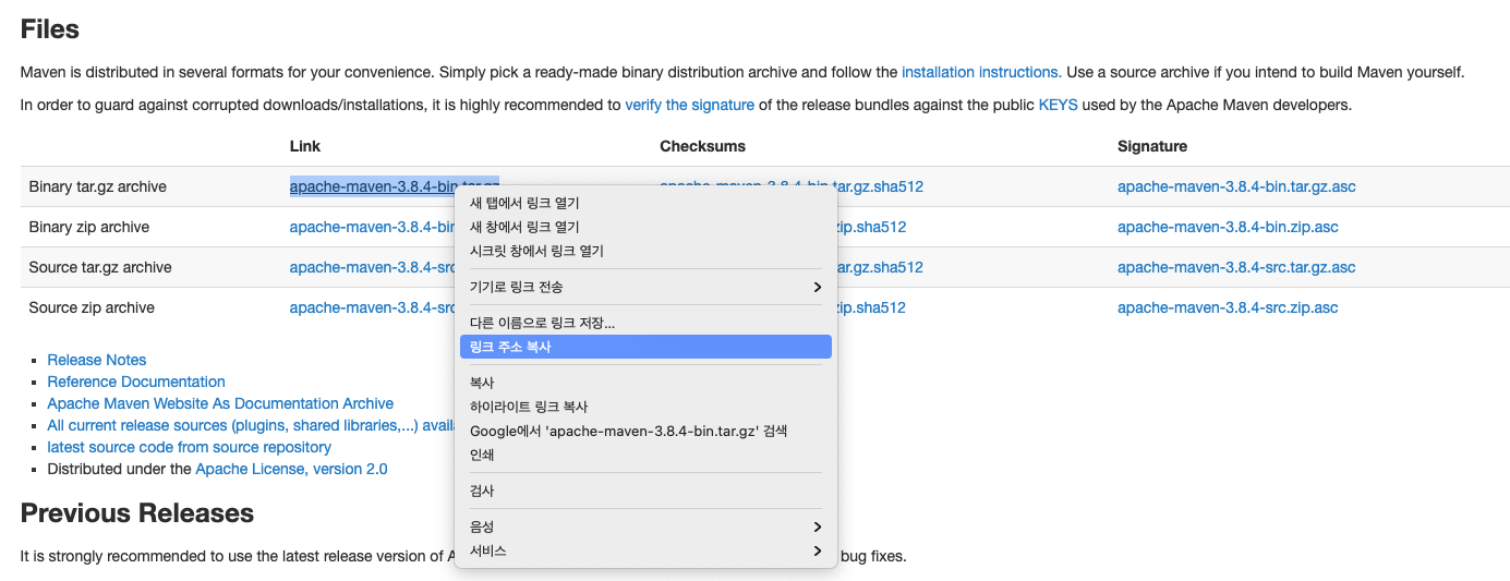 Files 항목 중 'Binary tar.gz archive'의 Link 항목을 우클릭해서 다운로드할 수 있는 링크 주소를 복사한다.