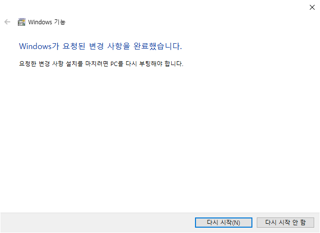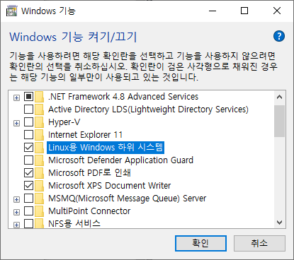 제어판에서 '원도우 기능 켜기/끄기' 메뉴를 찾아가서 'Linux용 Windows 하위 시스템' 항목의 체크박스를 선택하고 [확인]을 누른다. 약간의 시간이 지나고 시스템을 재부팅하면 WSL 기능이 활성화 된다.