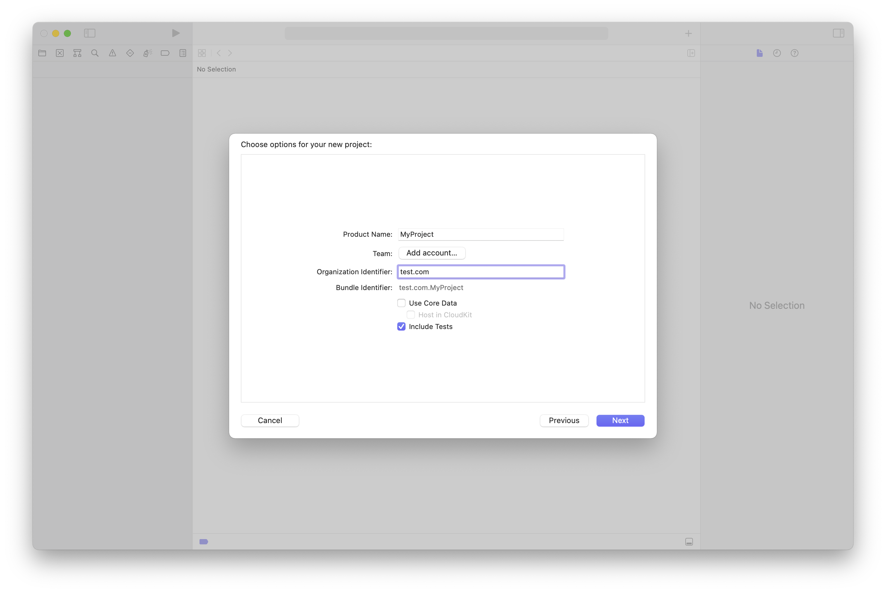 프로젝트의 이름(Product Name)과 조직명 (Organization Identifier), 번들 아이디 등의 정보를 입력할 수 있다. 간단한 프로젝트 이름을 입력하고, test.com이라고 조직 명을 입력한 다음 Next 버튼을 클릭해서 진행한다.