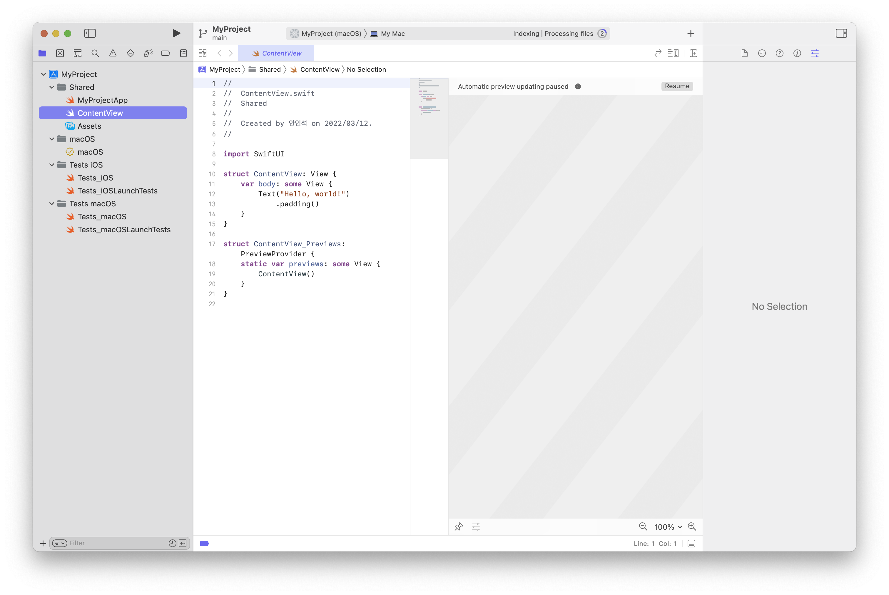 프로그래밍을 할 때, 맨 처음 작성하는 프로그램인 'Hello World' 코드가 코딩되어 있다. 화면의 중앙 우측에 있는 Automatic preview updating paused 옆에 'Resume' 버튼을 클릭하면 구현하고 있는 앱의 화면을 미리 볼 수 있다.