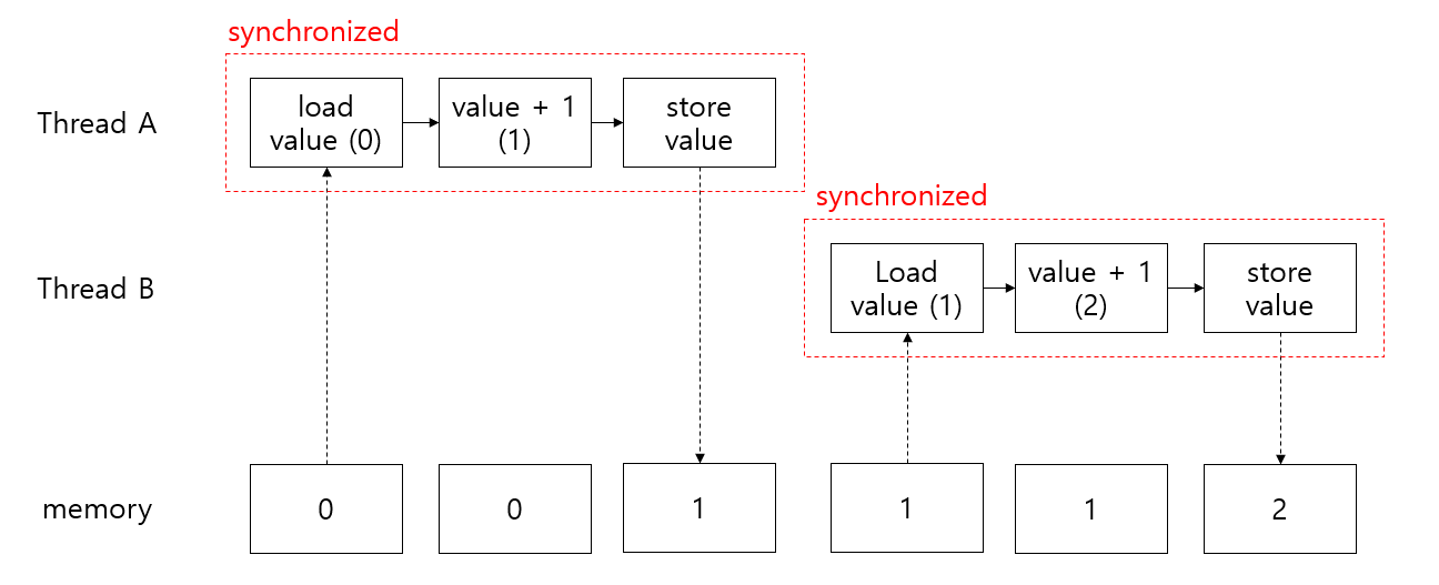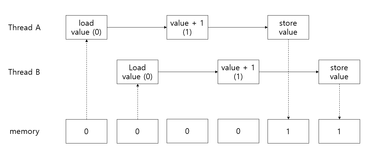 메모리에 있는 value 값이 0인 상황에서 두 스레드가 동시에 시작했다고 생각해보자. 두 스레드는 메모리에 있는 값 0을 레지스터에 로드한다. 그리고 각각 독립적으로 +1 연산을 해서 둘 다 1이라는 값을 만들어 낸다. 이 후 두 스레드 모두 1이라는 값을 메모리에 있는 value 변수에 쓴다.