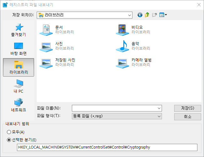 만약 윈도우 시스템의 전체 레지스트리 값을 백업하고 싶으면 '내보내기 범위' 항목에서 '모두'를 선택하면 된다. 다만 전체 레지스트리 값을 백업하고 복구하는 것은 추천하지 않는다. 일부 레지스트리 값은 시스템에 의해서만 변경되는 경우도 있고, 전체 레지스트리를 다시 덮어쓰는 과정에서 예기치 못 한 오류가 발생할 수도 있다.