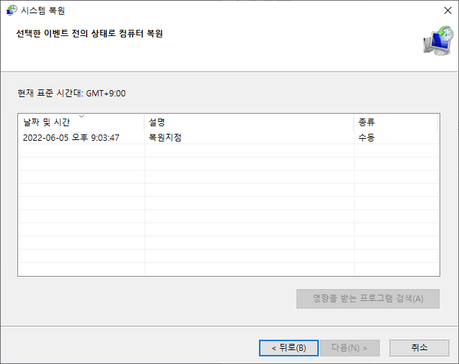 과거 만들어 두었던 복원지점들을 확인할 수 있고, 그 지점으로 컴퓨터를 복원할 수 있다.