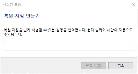 그러면 복원 지점 만들기 기능을 사용할 수 있다. 복원지점을 잘 기억할 수 있도록 복원지점에 대한 설명을 입력하고 만들기를 누르면 복원지점이 생성된다.