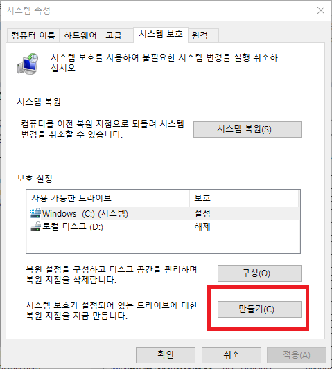 그러면 '시스템 속성'의 '시스템 보호' 탭으로 들어가게 된다. 하단의 '시스템 보호가 설정되어 있는 드라이브에 대한 복원 지점을 지금 만듭니다'의 '만들기'를 선택한다.