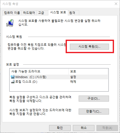 다시 시스템 보호 탭으로 돌아가서 '시스템 복원' 버튼을 눌러보면