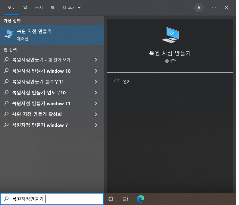 윈도우 검색창([윈도우키] + Q)에 복원지점 만들기를 검색한 후 실행하자.