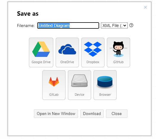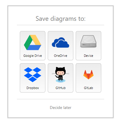 app.diagrams.net에 접속하면 우선 작성중인 다이어그램 파일을 어디에 저장할 것인지 선택할 수 있다. 구글 드라이브와 원드라이브, 드랍박스 같은 클라우드 스토리지에 저장할 수도 있고 로컬 디바이스로 다운로드할 수도 있다.