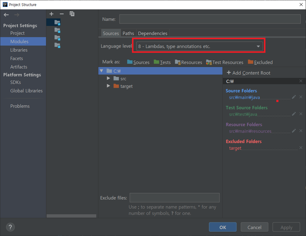 물론 File > Project Structure > Modules 메뉴에서 프로젝트를 구성하고 있는 모듈 별로 SDK와 Language Level을 지정할 수도 있다.