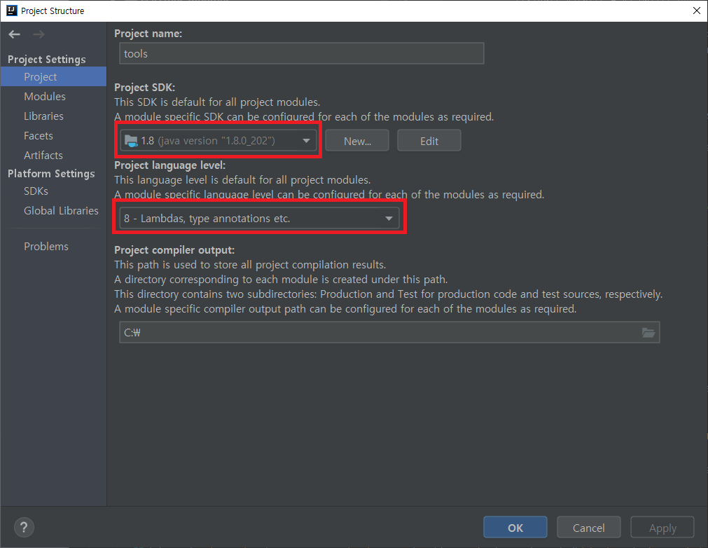 그 밖에 File > Project Structure > Project > Project SDK 로 들어가보면 프로젝트의 SDK와 Language Level을 설정할 수 있다. 이를 설정하면 프로젝트에 속한 모듈에 프로젝트 설정을 기본값으로 적용할 수 있다.
