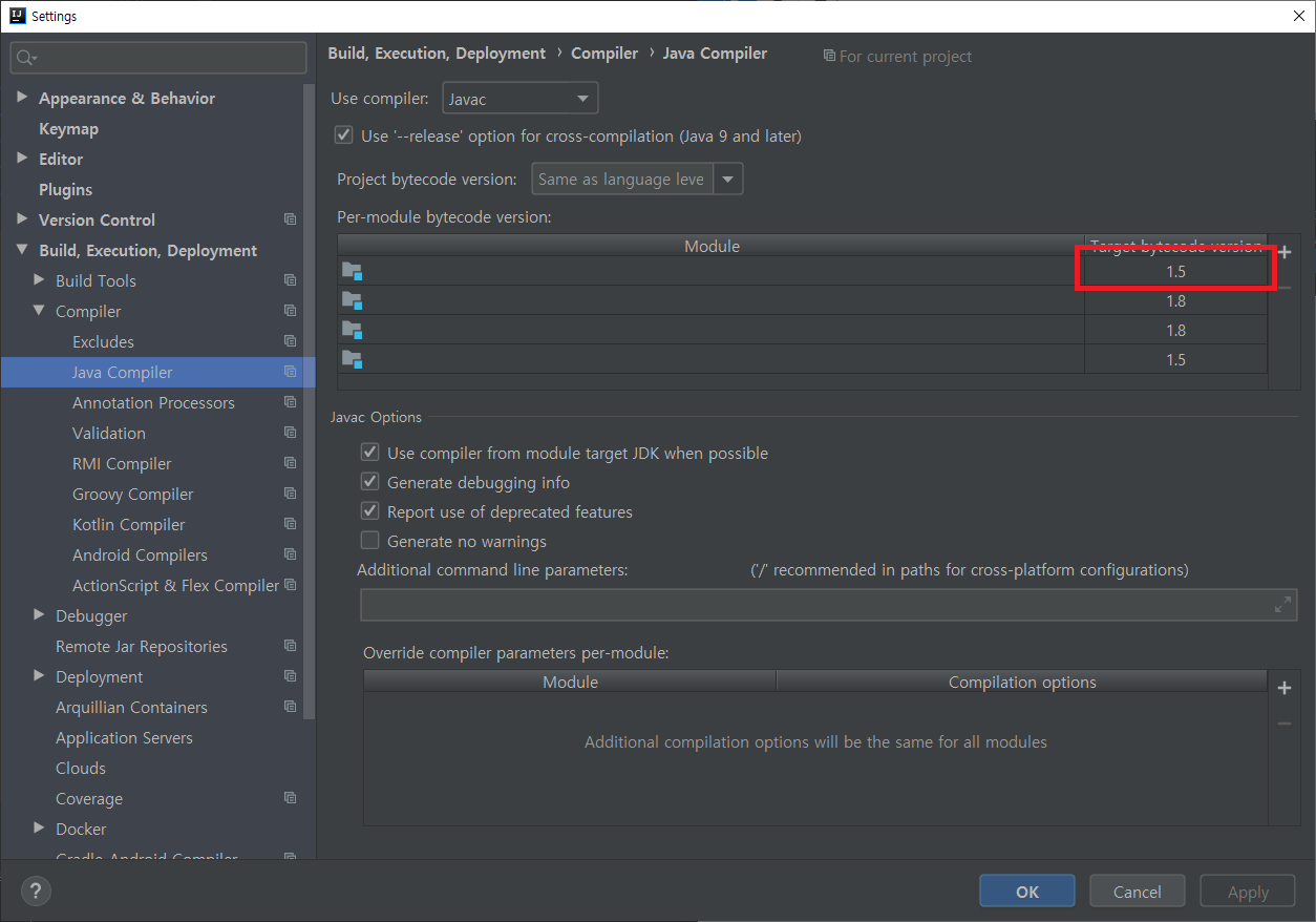 우선 Settings 창을 열고 Build, Execution, Deployment > Compiler > Java Compiler 메뉴를 들어가보면 일부 모듈의 Target bytecode version이 다른 것을 볼 수 있다. 저걸 수정해주면된다.