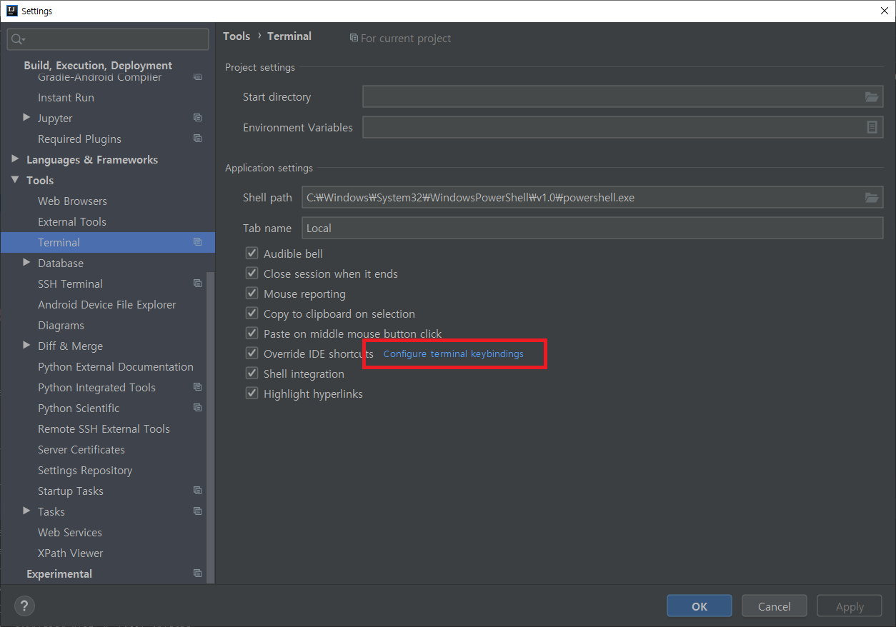 IntelliJ의 설정을 변경하면 이런 문제를 해결 할 수 있다. Settings > Tools > Terminal 항목을 선택하면 아래와 같은 화면을 볼 수 있다. "Configure terminal keybindings" 항목을 클릭한다.