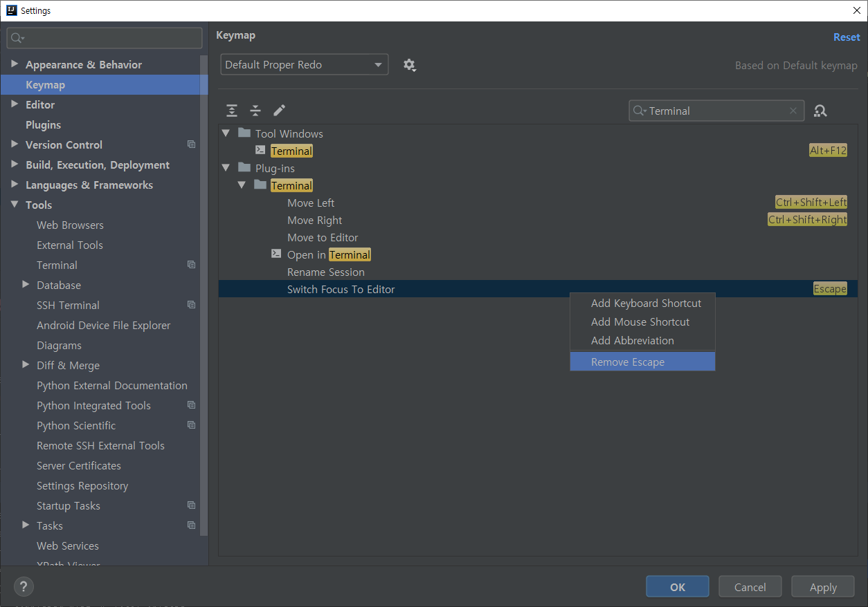 Plug-ins 항목의 서브 항목 중 Terminal에서 "Switch Focus To Editor" 항목을 찾아보자.