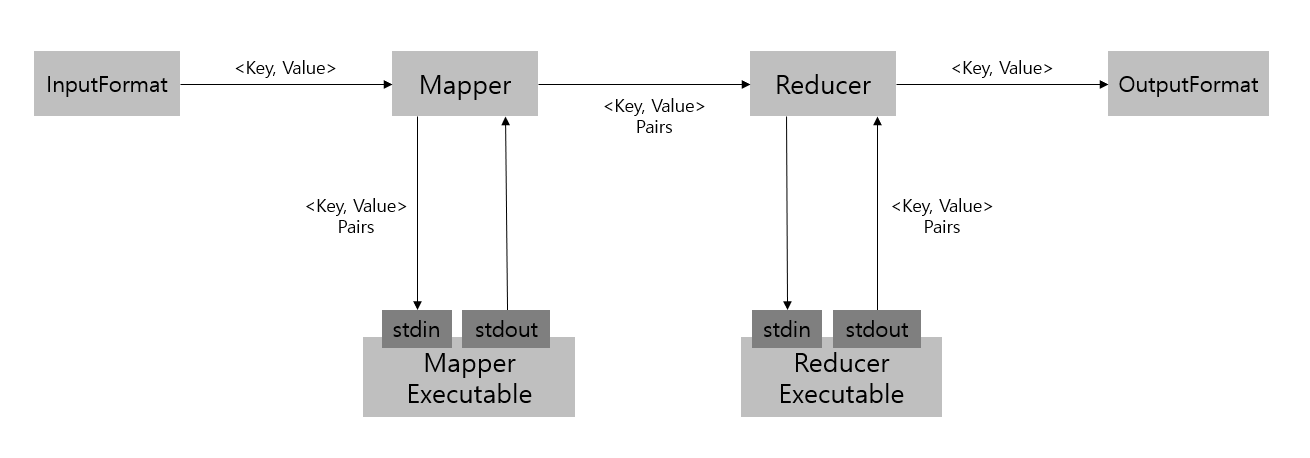 Submit 된 MR 작업이 초기화 되는 과정에서 Mapper들이 초기화(Initialize)될 때, 별도 프로세스를 생성해서 Mapper로 사용될 프로그램이나 스크립트를 실행하게 된다. 이 후, Mapper는 InputFormat에서 만들어진 Key-Value 쌍을 Mapper로 사용될 프로그램의 표준 입력으로 텍스트 라인 형태로 넘겨준다. 기본적으로 Key에 해당하는 문자열과 Value에 해당하는 문자열을 탭 문자(\t)로 붙여서 텍스트로 만든다. (탭 문자 대신 다른 문자를 사용하도록 설정할 수 있다.)