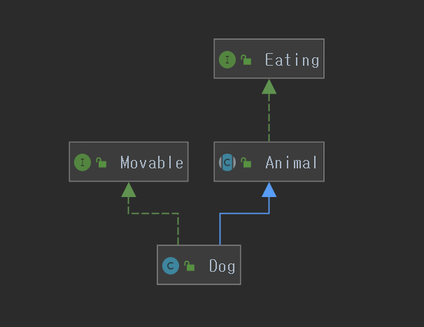 Animal 클래스는 Eating 인터페이스를 구현한 abstract 클래스다. 이를 상속받아서 Dog 클래스 구현되는데 Dog 클래스는 Movable 인터페이스를 구현하고 있는 상태다.