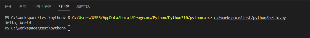 실행하면 VSCode 하단의 터미널 탭에서 파이썬이 실행되고, 현재 파일을 실행한 결과를 볼 수 있다.
