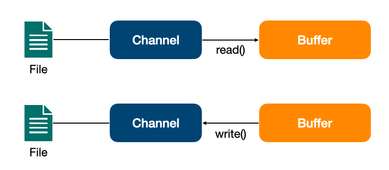 마지막으로 채널은 항상 버퍼라는 NIO 컴포넌트와 함께 사용되며, 채널에서 데이터를 버퍼로 읽어 들이거나 버퍼에 있는 데이터를 채널로 쓰게 된다.