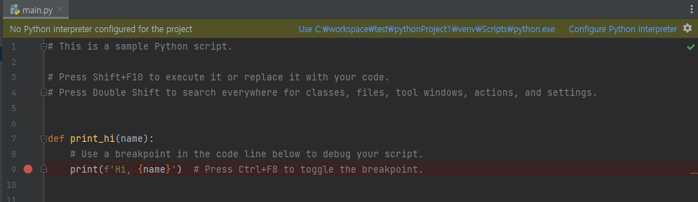 에디터 창의 상단에는 방금 만들어진 가상환경에 있는 인터프리터를 쓸 것인지를 묻는 안내가 친절하게 나온다. Use C:\workspace\test\pythonProject1\venv…. 어쩌구를 선택하자.