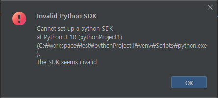 그러면 Invalid Python SDK라는 에러 메시지가 뜬다. OK를 누르고 파이참을 다시 실행해보자. 다시 실행하면 이런 문제는 없이 제대로 동작한다.