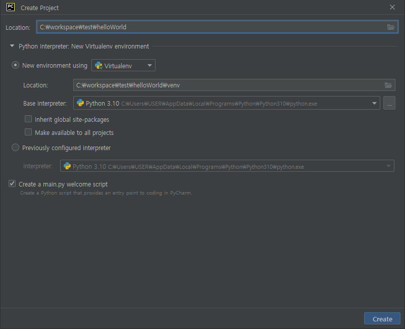 프로젝트가 생성될 경로와 파이썬 인터프리터 설정을 해주면 된다. 'Create'를 눌러 진행하면...