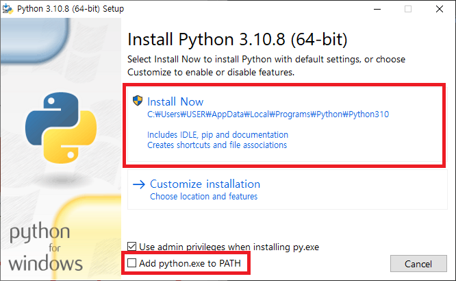다운로드한 설치 파일을 실행해서 설치를 진행하면 된다. 이 때, 'Add python.exe to PATH'를 선택해주면 따로 환경변수 추가를 하지 않아도 파이썬 실행을 바로 할 수 있다.
