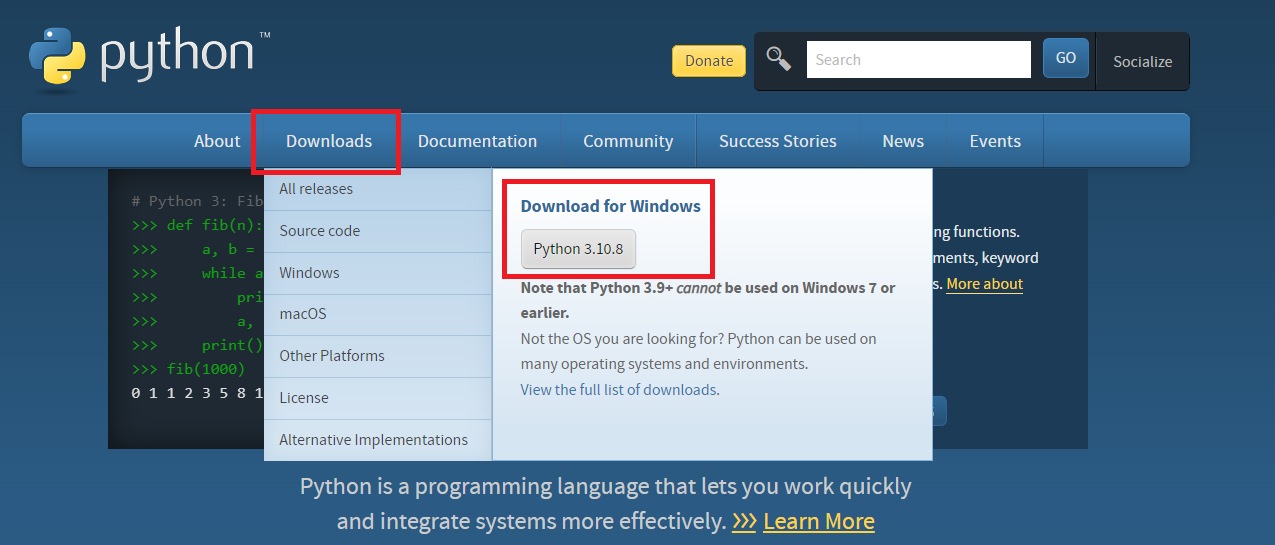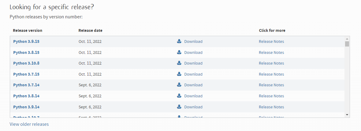 현재 최신 버전은 3.10.8이다. 만약 특정 버전의 파이썬 환경이 필요한 경우라면 'Download' 탭을 클릭하자.