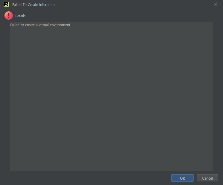 에러가 나는 경우가 있다. 가상환경을 만들지 못했다는 얘기인데, 일단 'Ok'를 눌러 진행하고 수동으로 가상환경을 만들어 주자. 터미널을 열어 프로젝트의 루트 디렉토리에서 다음을 실행해 준다.