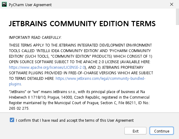 무료 버전도 간단한 파이썬 개발에는 무리가 없으므로 설치해도 좋다. 설치 파일을 다운로드해서 실행하면 파이참이 설치된다.