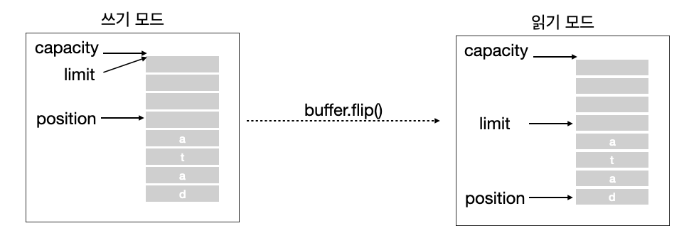 buffer.flip() 메소드를 실행하면 쓰기 모드의 position 값이 limit 값으로 치환되고, position 값은 0으로 초기화 된다.